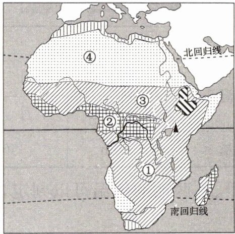 4. 某地全年高温,7月干燥,草木枯黄;1月湿热,植被茂盛。该地位于图中(