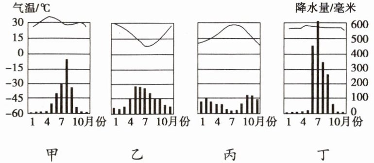 5. 读四地气温变化曲线和降水量柱状图,图中甲、乙、丙、丁四地气候类型分别是(