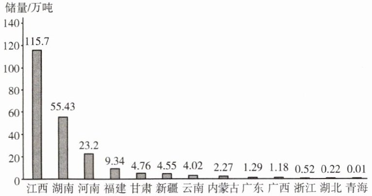 钨矿及其合金是国防及高技术应用中极为重要的功能材料之一,被誉为“高端制造的脊梁”。中国是世界上最大的钨储量国,但受选矿、冶炼等技术限制,钨矿利用率较低,仍需大量进口钨矿砂及其精矿。下图示意某年我国钨矿资源储量分布。据此,完成22~23题。