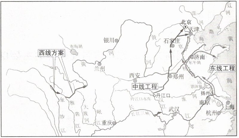材料二 解决水资源地区分布不均的有效办法之一是跨流域调水。为了缓解北方地区严重缺水的状况,我国正在实施南水北调工程,把长江流域丰富的水资源调到华北地区和西北地区。下图为南水北调工程示意图。