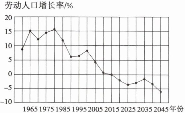 读我国1965~2045年劳动人口增长率变化图(含预测),完成第2题。