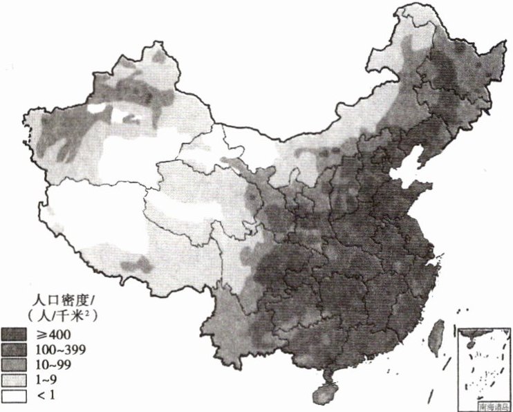 1. 我国人口14亿多,分布很不均匀。读我国人口分布图,下列地区属于我国人口密集区的是(