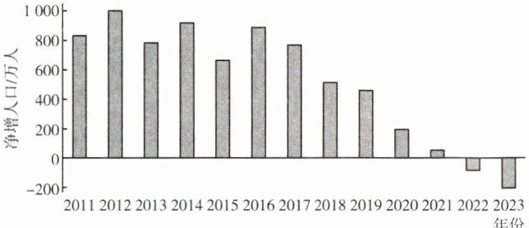 我国上海、北京、广东等省级行政区目前已先后开展“时间银行”服务。“时间银行”是指志愿者将自己向老年人提供服务的时间储存起来,未来需要别人向自己提供服务时,用储存的时间兑换,存“时间”兑“养老服务”。下图为我国2011~2023年净增人口数量统计图。读图,完成1~3题。