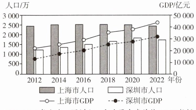 3. 关于2012~2022年上海、深圳人口和GDP的变化,表述正确的是(