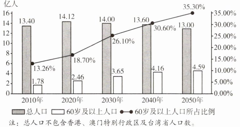 读我国2010~2050年人口和60岁及以上人口数据(含预测)图,完成1~2题。
