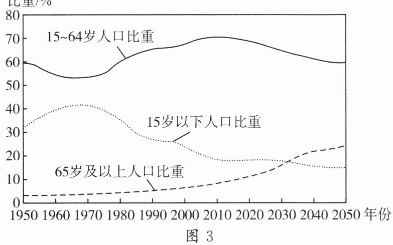 “人口红利”是指一个国家的劳动年龄(15~64岁)人口占总人口比重较大,为经济发展创造有利的人口条件。图3为我国人口年龄结构变化(含预测)图。