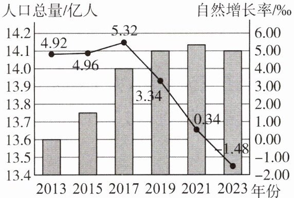 [解析]读图可知,我国人口出现负增长,意味着新生儿数量少,老年人口多,会让养老负担加重;总量不是持续增长,自然增长率在2017以后逐年下降,年龄结构没有优化。