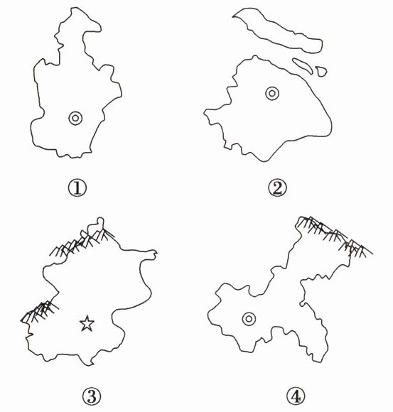 读我国直辖市轮廓图(比例尺不一致),完成2~3题。