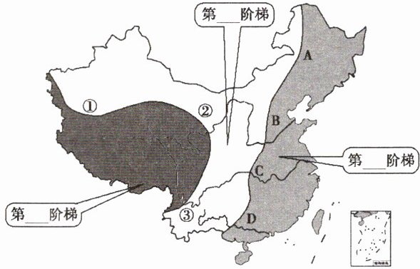 。(3)图中的字母A、B、C、D是我国地势第二级阶梯与第三级阶梯的分界线,它们的名称是A