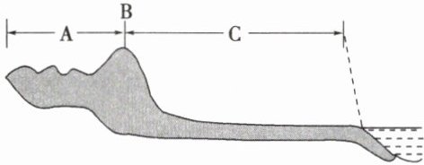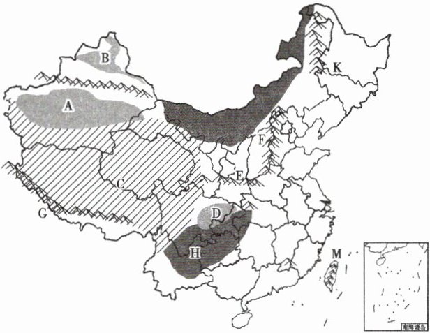 (1)将图中字母所代表的地形区名称,分别填在相应的横线上。
