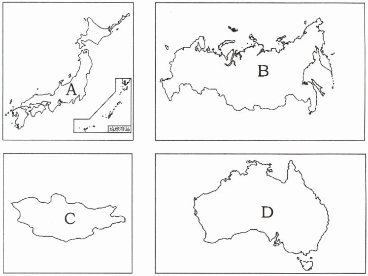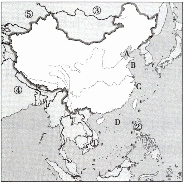(3)A、B、C、D 代表我国东部濒临的海洋,我国领土最南端的曾母暗沙位于图中的(
