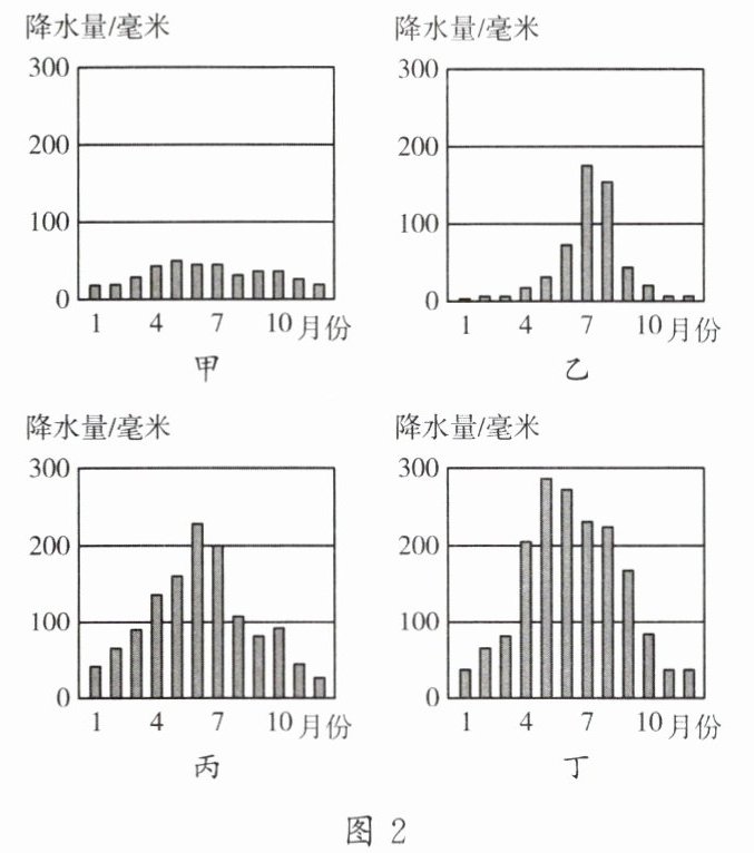 D. 丁地降水均匀