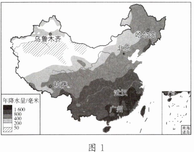 - 图1为我国年降水量分布示意图,图2为四地降水量柱状图。读图,完成6~7题。
