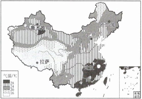 - 读我国7月平均气温分布图,完成1~2题。