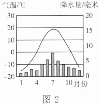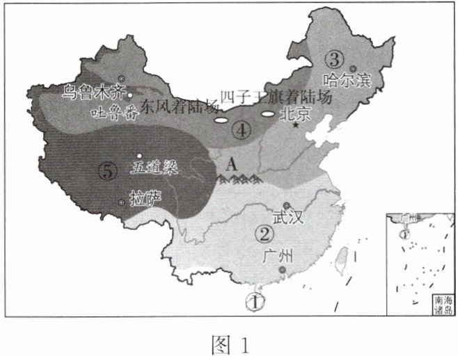 材料二 我国气候类型分布示意图(图1)及着陆场气温曲线和降水量柱状图(图2)。