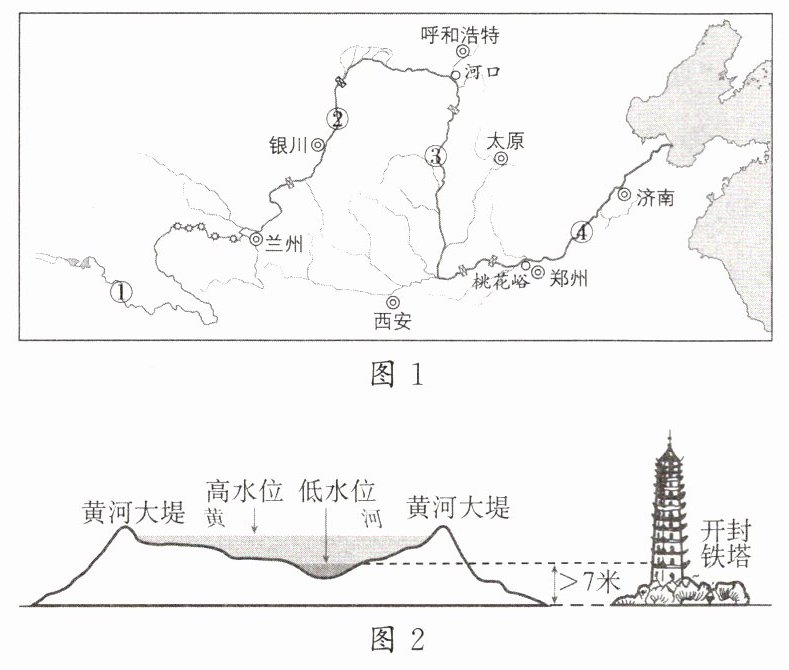 <题目>黄河含沙量大,河水挟带大量泥沙在入海口处形成了“黄龙入海”的景观,黄河各河段也存在着许多生态问题。读黄河流域图(图1)和开封“地上河”示意图(图2),完成1~2题。
