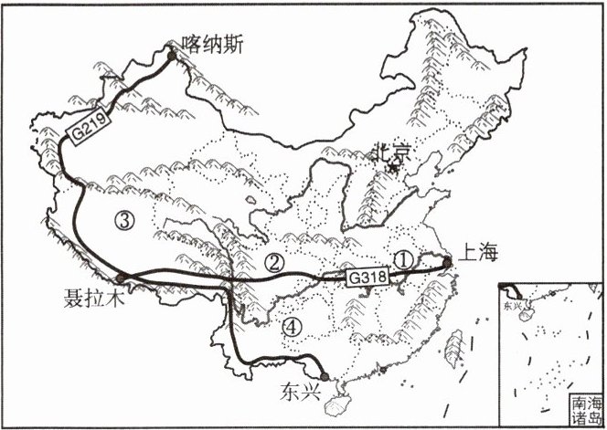 (2)219国道起点是新疆北端的喀纳斯,终点是广西的东兴,途中经过的山脉有阿尔泰山脉、天山山脉、昆仑山脉和横断山脉,A错误;318国道起点是上海黄浦,终点是西藏日喀则的聂拉木县,途中经过上海市、江苏省、浙江省、安徽省、湖北省、重庆市、四川省和西藏自治区,没有经过河南省,B错误;318国道起点是上海黄浦,终点是西藏日喀则的聂拉木县,整条路线呈东西走向,C错误;读图可知,两条国道都经过了西藏自治区,D正确。