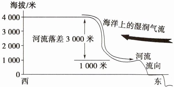 C[解析]西高东低的地势有利于东部海洋的湿润气流深入内陆,故A正确;使大河东流,沟通东西交通,故B正确;内河航运与河流的流量、结冰期以及水流是否平稳等因素有关,与流向关系不大,故C错误;阶梯交界处巨大的落差产生巨大水能,故D正确。