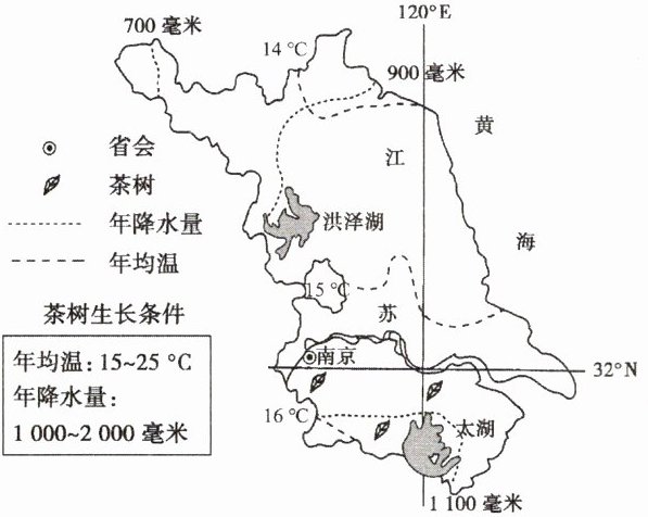 中国人自古喜爱饮茶,茶叶生长往往需要一定的自然条件,江苏绿茶享誉世界。读图,完成8~9题。