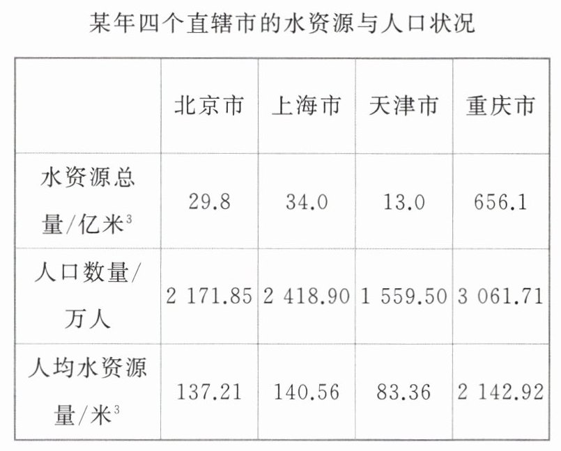 我国四个直辖市的水资源存在差异。读表,完成 3~5 题。