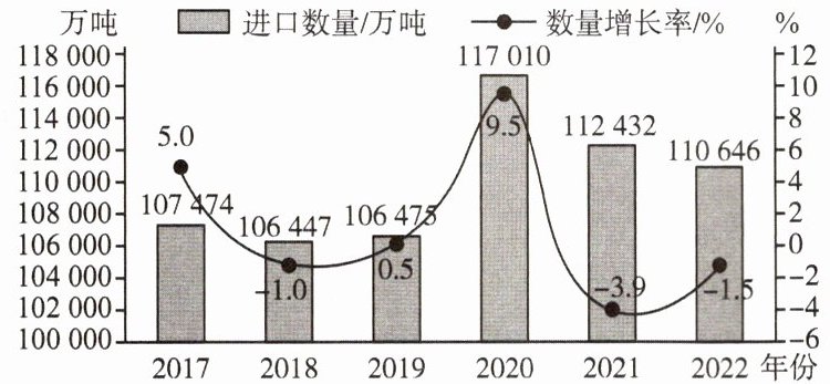 截至2022年底,我国铁矿石储量为162.5亿吨,居世界第四位。但2022年我国铁矿石进口量为11.07亿吨,是世界上铁矿石进口第一大国,铁矿石进口主要来自澳大利亚、巴西等国家。如图是2017~2022年我国铁矿石进口量及增长情况统计图。据此,完成1~2题。