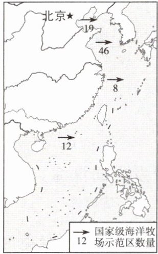 中国海洋资源丰富,海洋牧场是将人工培育的海洋生物聚集在一定海域内,进行有计划放养的新兴生产方式。下图示意我国国家级海洋牧场示范区在四大海域的分布。据此,完成7~8题。