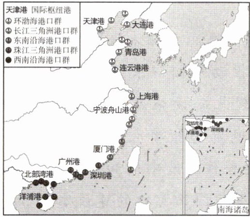 2024年,我国港口货物吞吐量继续稳居世界第一。读我国沿海地区的港口群分布示意图,完成5~6题。