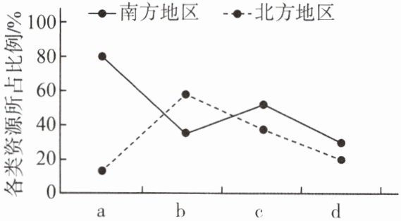 下图为我国南方地区和北方地区土地面积、水资源总量、人口及耕地等指标对比图。读图,完成3~4题。