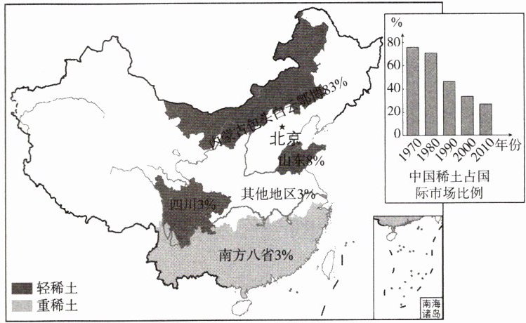 )①北多南少 ②南方以轻稀土为主 ③分布最多的省级行政区简称新 ④北方以轻稀土为主