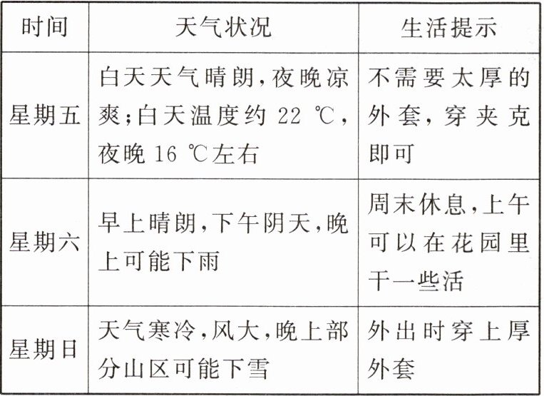 One possible version:This is Zhou Hua, your weatherman.Now let's look at the weather report for tomorrow and the weekend.Friday will be warm and sunny during the day,cool at night. The temperature will be about 22℃ during the day and around 16℃ at night. You won't need a heavy coat. A jacket is fine with you.It will be nice on Saturday morning and cloudy in the afternoon. It may rain at night. So you will have clear weather to do some gardening on Saturday morning.Sunday will be cold and windy,and maybe it will snow in some mountains at night. If you are planning to go there,don't forget your heavy coat.