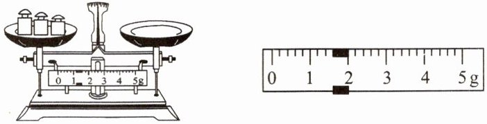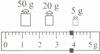 5. 在使用托盘天平测量某金属块的质量时,小明调节横梁水平平衡后,把金属块放在左盘,用镊子向右盘加减砝码并调节游码,直至横梁恢复水平平衡状态,此时砝码的质量和游码的位置如图所示,则金属块的质量测量值为