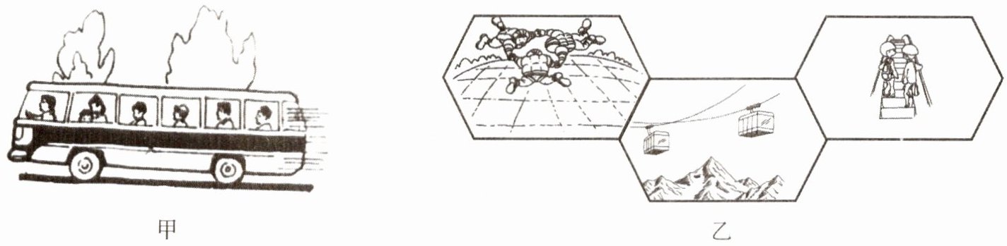 处于相对静止的一组物体,它们相对于其他物体的运动情况是完全相同的。相对静止在生产生活中有很多实例,比如在空中保持固定队形的跳伞运动员、食品车间随着传送带一起运动的糕点、同一条缆绳上正在运行的缆车和站在上行电梯的游客等(图乙)。