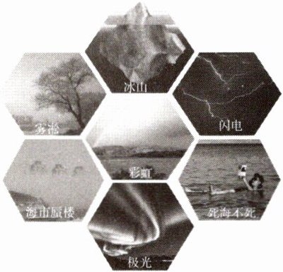 1.冰山(热学和力学)、雾凇(热学)、死海(力学)、闪电(电磁学)、彩虹(光学)、极光(电磁学和光学)、海市蜃楼(光学)