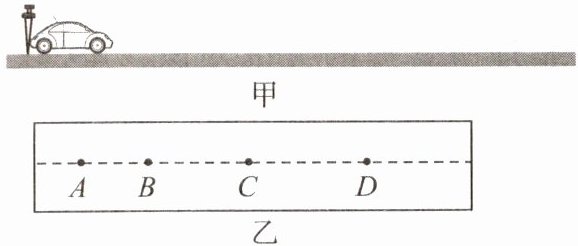 7. 小明自制了一个每秒滴下 2 滴水的“滴水计时器”。他把滴水计时器固定在玩具车上,并把玩具车放置在水平木板上,用来测量玩具车运动的速度,如图甲所示。释放玩具车后,水滴在木板上的位置如图乙所示。如果小明要测量玩具车在 A、D 间的速度,他还需要知道什么物理量?玩具车在 A、D 间的速度是多少?(待测物理量用符号表示)