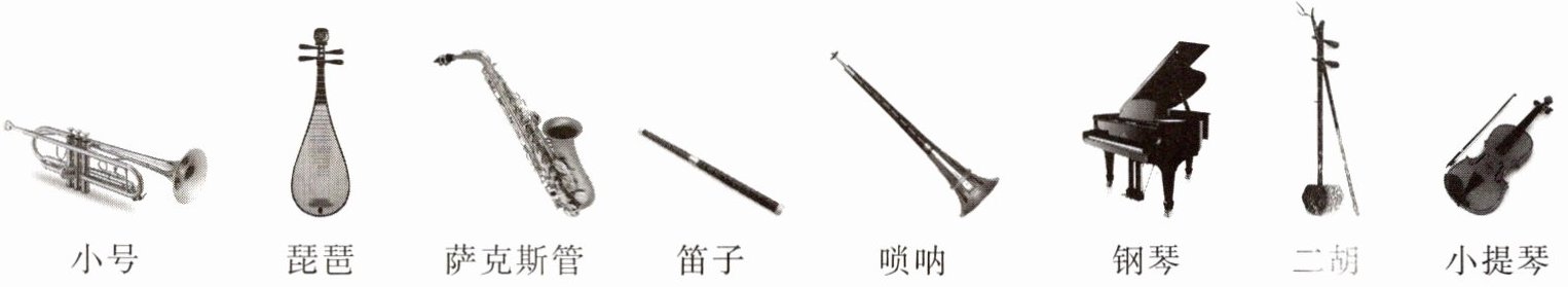 A 类:琵琶、钢琴、二胡、小提琴等弦乐器,它们是依靠弦振动发声的。B 类:小号、萨克斯管、笛子、唢呐等管乐器,它们是依靠空气振动发声的。