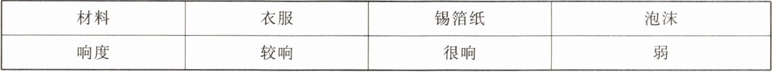 。(3)小明打算对比几种材料(例如衣服、锡箔纸、泡沫塑料)的隔音效果,为此,他将声源放置在鞋盒内,并在鞋盒四周填满待测试的材料。然后,他站在离鞋盒一定距离的位置,仔细聆听并比较所听到声音的响度。得到的现象如下面表格所示,得到待测材料隔声性能由好到差的顺序是