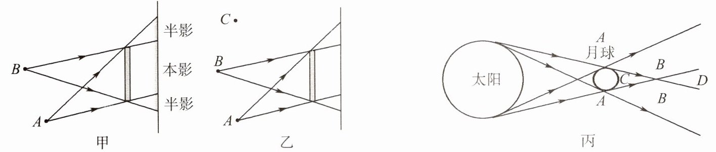 (4)请依据前述知识,参照图丙对日食现象进行阐释。在____区域可观察到日全食,在____区域可观察到日偏食,在____区域可观察到日环食。