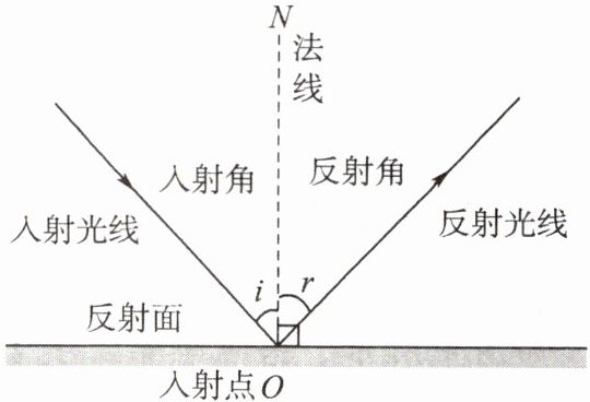 规定 探究光的反射定律,就是在入射点与反射面的位置保持不变的情况下来研究反射光与入射光的位置关系,为此可以像选择参照物一样选定一条相对于反射面和入射点不动的直线作参照,来描述反射光和入射光的位置。我们规定过入射点 $ O $ 作一条垂直于反射面的直线 $ ON $,这条直线称作法线。反射光线与入射光线的位置关系,就可以用它们与法线之间的夹角来描述。