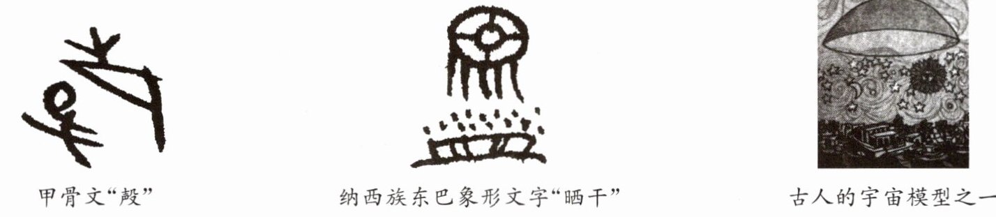 甲骨文“殸”,意指手持长柄,敲击乐器发声。东巴文“晒干”,已含有太阳光使地表水分蒸发的科学思索。古人通过对日月星辰及周围事物的观察,设想宇宙的模样。有人认为地球是平的,日月星辰在大气中运行,其上方扣着穹顶。