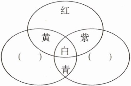 色光三原色是红、绿、蓝。图中三个圆分别代表三原色,已知上方为红,红与左圆混合为黄,红与右圆混合为紫,三原色混合为白,左圆与右圆混合为青。根据红+绿=黄,红+蓝=紫,绿+蓝=青,可知左圆为绿,右圆为蓝。