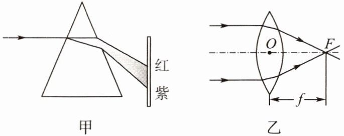 2. 如图所示,小薇在探究光的色散现象时,看到白光经三棱镜后,光屏上自上而下出现了红、橙、黄、绿、蓝、靛、紫的色带,小薇对产生的原因进行了思考。受此启发,在测量凸透镜的焦距时,小薇想:如果分别用红光和紫光平行于同一个凸透镜的主光轴射入,红光、紫光对凸透镜的焦距是否不同呢?请写出你的推断: