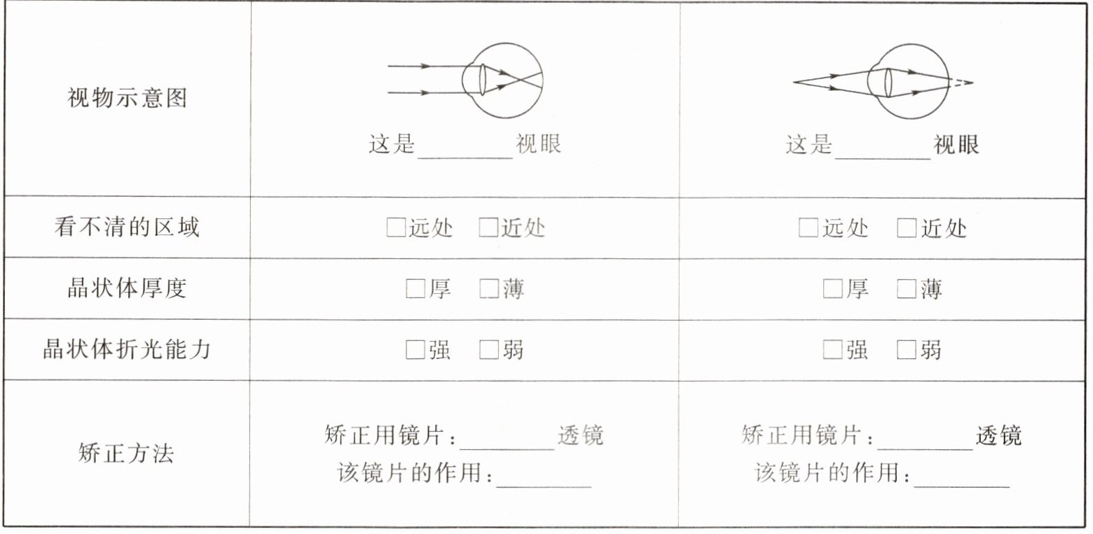 7. 善于观察的小明发现,张老师上课时,观察远处的同学时要摘下眼镜,而看近处的课本时,又要戴上眼镜。这样频繁地戴上摘下眼镜非常不方便。张老师的眼睛属于