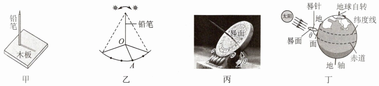 (选填“冬至”或“夏至”)。(3)上述实验中,小明发现除了影子长度变化外,等时间内影子转过的角度也不同。查阅我国古代的“日晷”,发现其区别是“晷面”和水平面有一个夹角,如图丙所示。该夹角确保了暑针和地轴平行,太阳光和晷针的夹角保持稳定,影子稳定且转速均匀,其位置关系简化图如图丁所示。威海市位于纬度37.5°,东经122.1°,则夹角等于