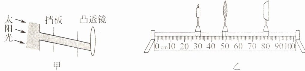 (1)让太阳光依次通过多个带孔的挡板,得到平行光后照射到凸透镜上,如图甲所示。若想找到透镜焦点,应