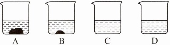 6. A、B、C、D四个烧杯中分别盛有等质量的水,在温度相同的条件下,向四个烧杯中分别加入$20g$、$15g$、$10g$、$5g$某物质,充分溶解后观察到如图所示的现象,请回答下列问题。