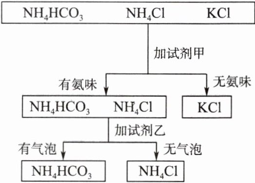 8. 下图是某同学鉴别 $ NH_4HCO_3 $、$ NH_4Cl $、$ KCl $ 三种化肥的过程,其中试剂甲和乙分别可能是(