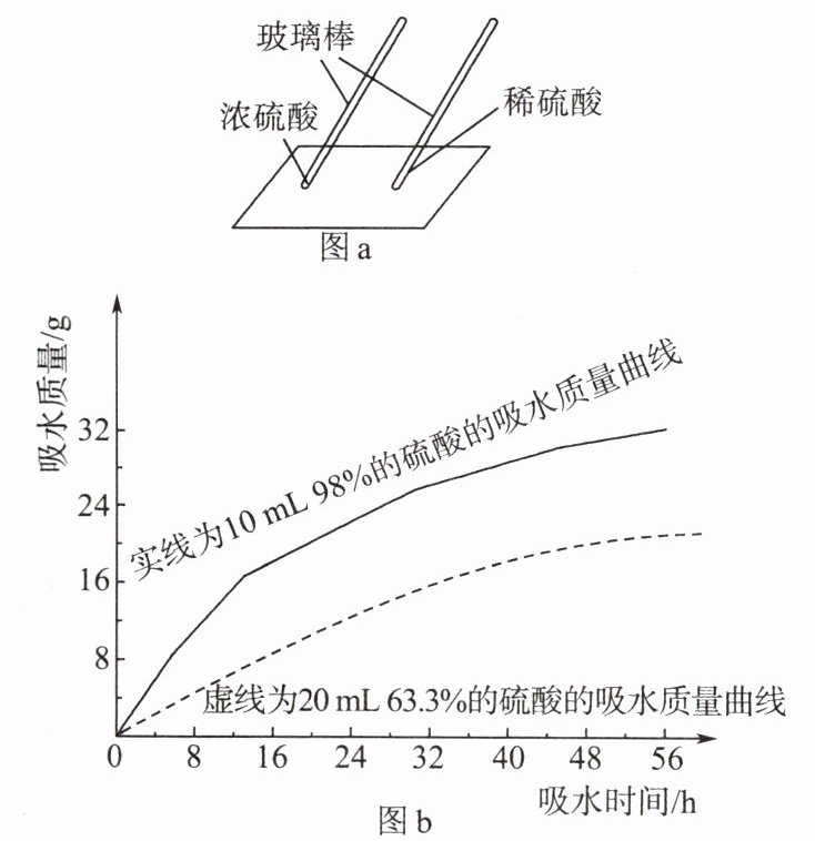 不同,它们的性质不完全相同。(2) 探究浓硫酸的吸水性:将10mL 98%的浓硫酸和约20mL 63.3%的稀硫酸(用10mL 98%的浓硫酸与10mL水配成)分别放入两个相同的烧杯中,称量、观察、记录、分析。根据室温环境下数天的实验数据,绘成的曲线如图b所示。