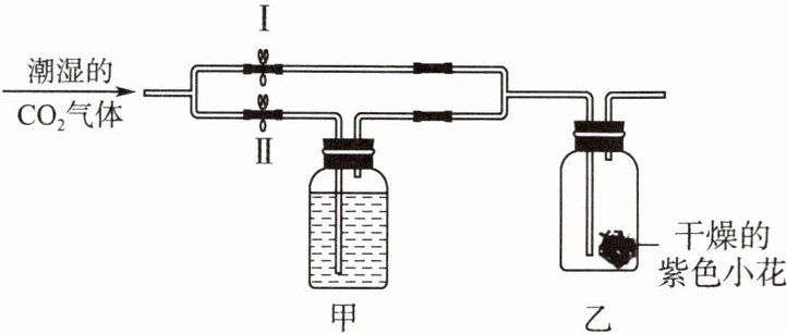 1. 如图所示,甲瓶中盛放的是浓硫酸,乙瓶中放的是用石蕊试液染成紫色的干燥小花。若关闭阀门Ⅰ,打开阀门Ⅱ,则紫色小花不变色;若关闭阀门Ⅱ,打开阀门Ⅰ,则紫色小花(