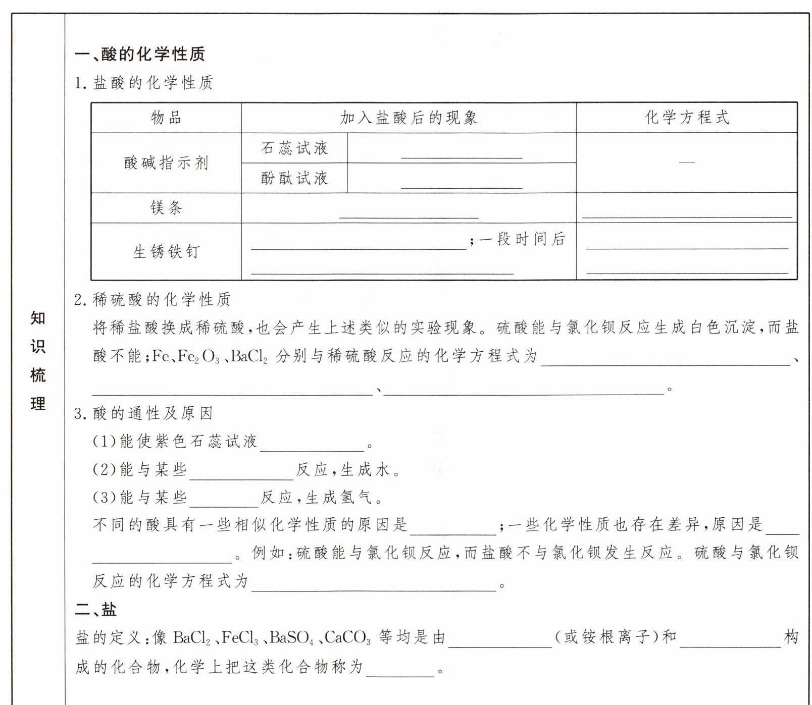 一、1.变成红色 不变色 产生大量气泡 Mg+2HCl=MgCl₂+H₂↑ 铁锈溶解,溶液变为黄色 有气泡产生,溶液逐渐变为浅绿色 Fe₂O₃+6HCl=2FeCl₃+3H₂O,Fe+2HCl=FeCl₂+H₂↑ 2.Fe+H₂SO₄=FeSO₄+H₂↑ Fe₂O₃+3H₂SO₄=Fe₂(SO₄)₃+3H₂O BaCl₂+H₂SO₄=BaSO₄↓+2HCl 3.