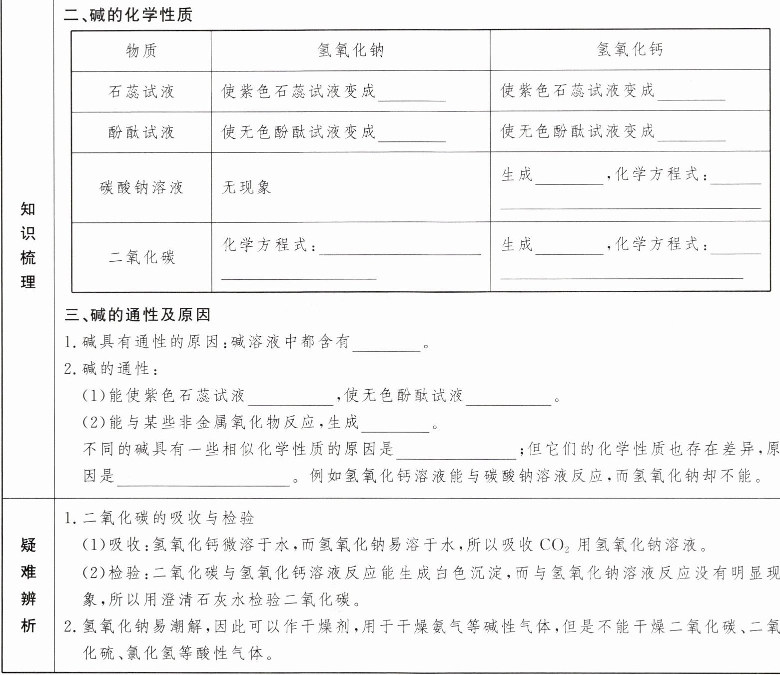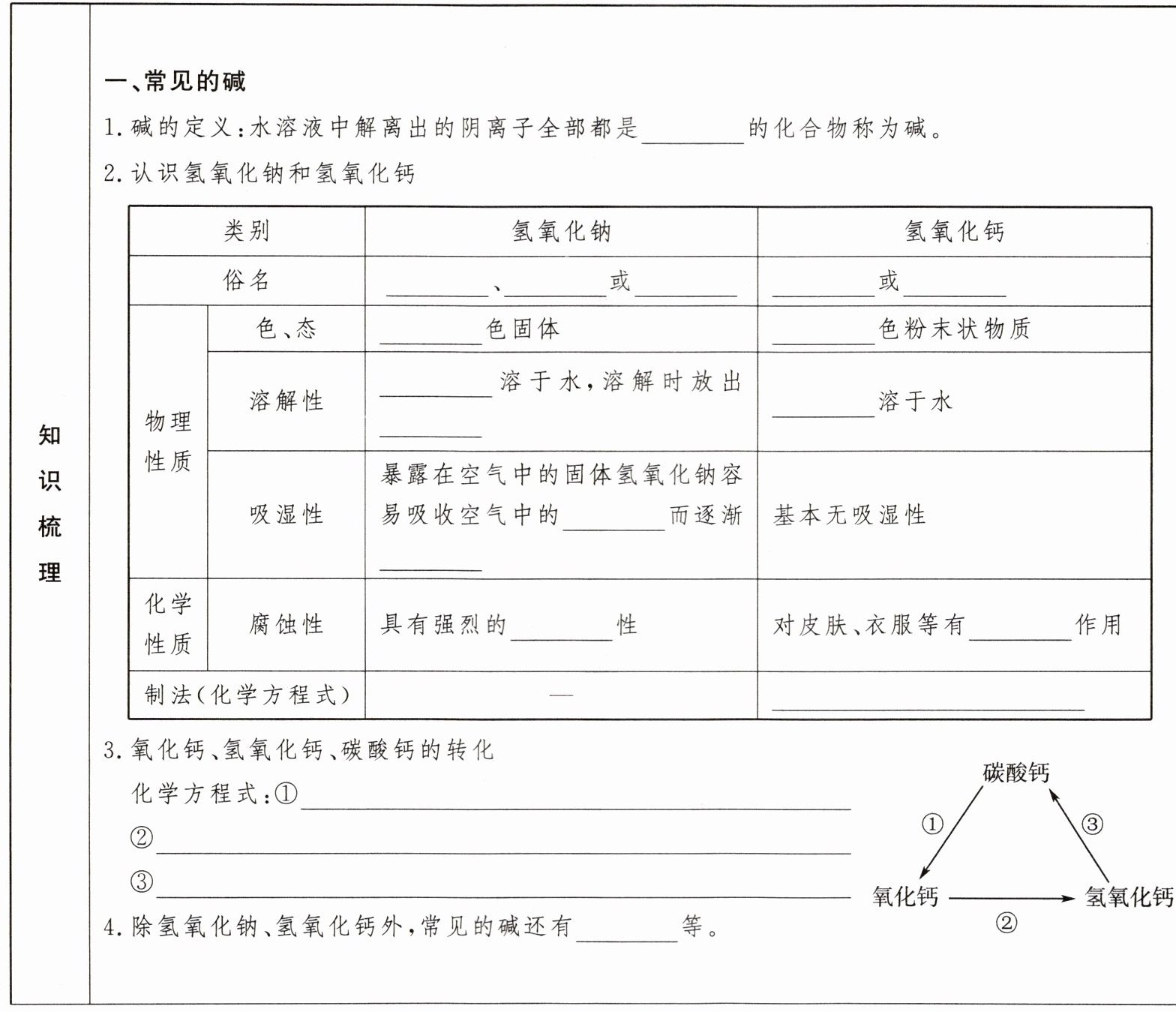 一、1.OH⁻ 2.烧碱 火碱 苛性钠 熟石灰 消石灰 白 白 易 热量 微 水蒸气 溶解 腐蚀 腐蚀 CaO+H₂O=Ca(OH)₂ 3.①CaCO₃$\frac{\underline{\;高温\;}}{}$CaO+CO₂↑ ②CaO+H₂O=Ca(OH)₂ ③Ca(OH)₂+CO₂=CaCO₃↓+H₂O[或 Ca(OH)₂+Na₂CO₃=CaCO₃↓+2NaOH] 4.KOH 二、 物质 氢氧化钠 氢氧化钙 石蕊 试液 蓝色 蓝色 酚酞 试液 红色 红色 续表 物质 氢氧化钠 氢氧化钙 碳酸钠 溶液 无现象 白色沉淀 Ca(OH)₂+Na₂CO₃ =CaCO₃↓+ 2NaOH 二氧化 碳 2NaOH+CO₂= Na₂CO₃+H₂O 白色沉淀 Ca(OH)₂+CO₂ =CaCO₃↓+H₂O 三、1.OH⁻ 2.